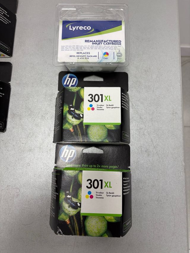 Cartuchos de tinta HP 301XL en color. - 2 Cartuchos de tinta tricolor originales. - 1 Compatible con modelos HP 301XL.