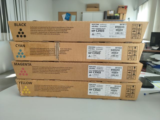 Cuatro cartuchos Ricoh C3503, black, cyan, magenta, yellow, en caja.