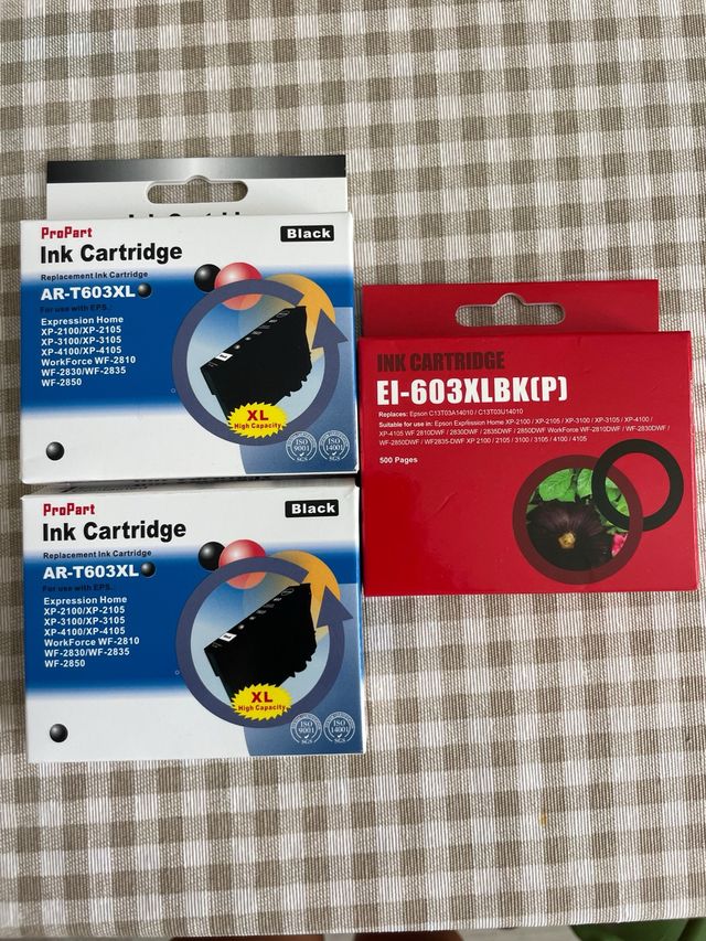 Detalles del productoDos son de tinta negra y otro de color. Los de tinta negra estàn fuera de fecha y uno de ellos lo abrí en su día para ver si le valía a mi impresora, pero está sin usar, desconozco si al estar abierta se pudo estropear.