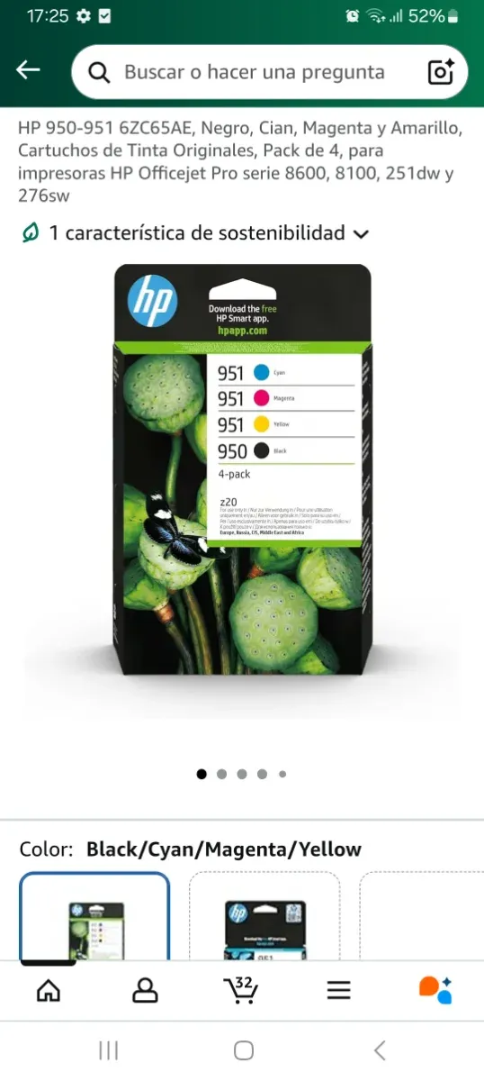 Detalles del productoPack de 4 cartuchos de tinta originales HP 950 y 951.