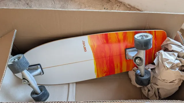 Detalles del productoTabla de skate Carver Firefly con un diseño vibrante en tonos naranjas y amarillos.
