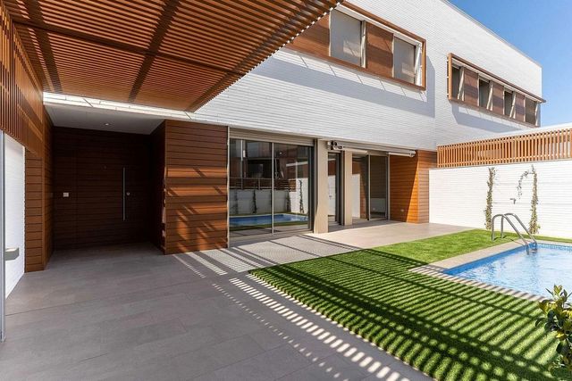 En la planta baja, disfrutarás del exterior con una fantástica terraza, jardín con césped artificial y piscina. En el interior, un amplio salón comedor con baño completo, una cocina independiente office, equipada con placa de inducción y campana extractora, y un lavadero con lavadora y secadora. Todo ello con salida al exterior para inundar de luz natural todas las estancias.