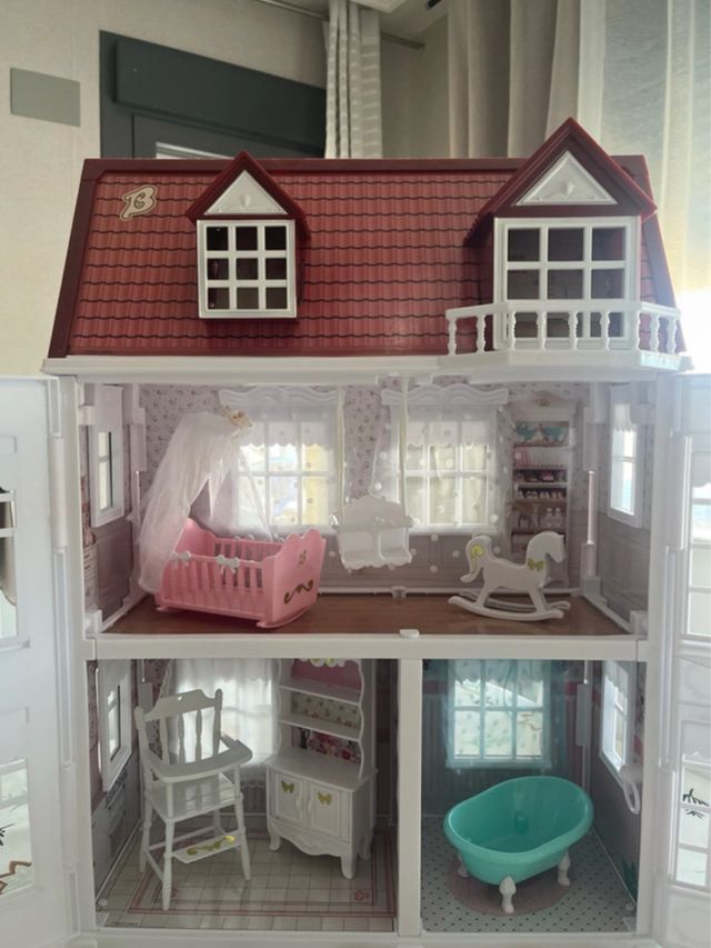 Casa de muñecas Barriguitas con varios accesorios. - Cuna rosa. - Caballito balancín blanco. - Bañera turquesa. - Silla alta blanca. - Armario blanco.