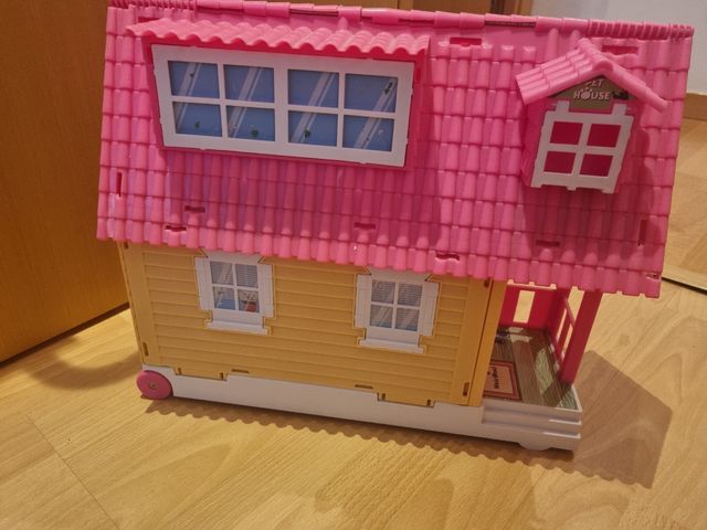 Casa de juguete tipo chalet con ruedas, facil de transportar. Incluye los accesorios de la foto, incluso una muñeca y un perrito