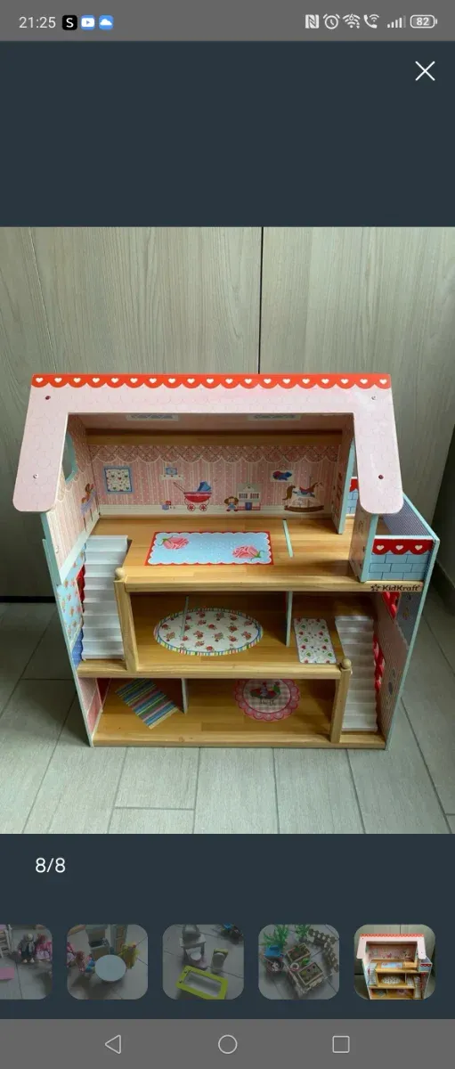 Detalles del productoCasa de muñecas de madera con varios niveles y accesorios.