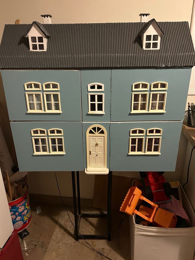 Detalles del productoCasa de muñecas de madera, pintada en color azul y con tejado gris.