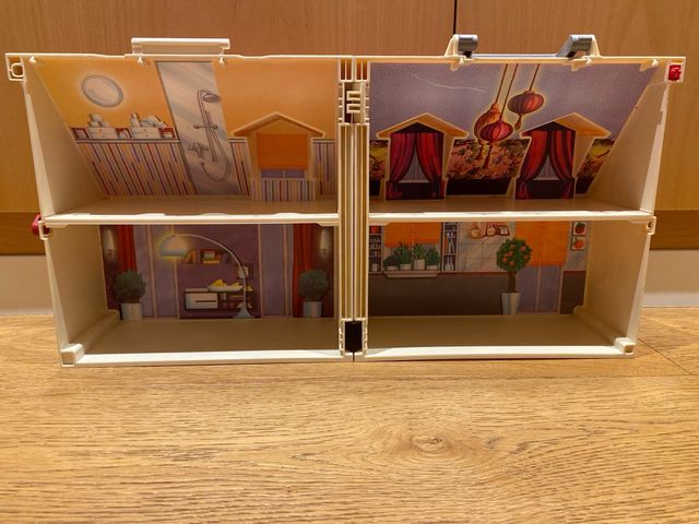 Detalles del productoCasa de muñecas de Playmobil con dos plantas y habitaciones decoradas.