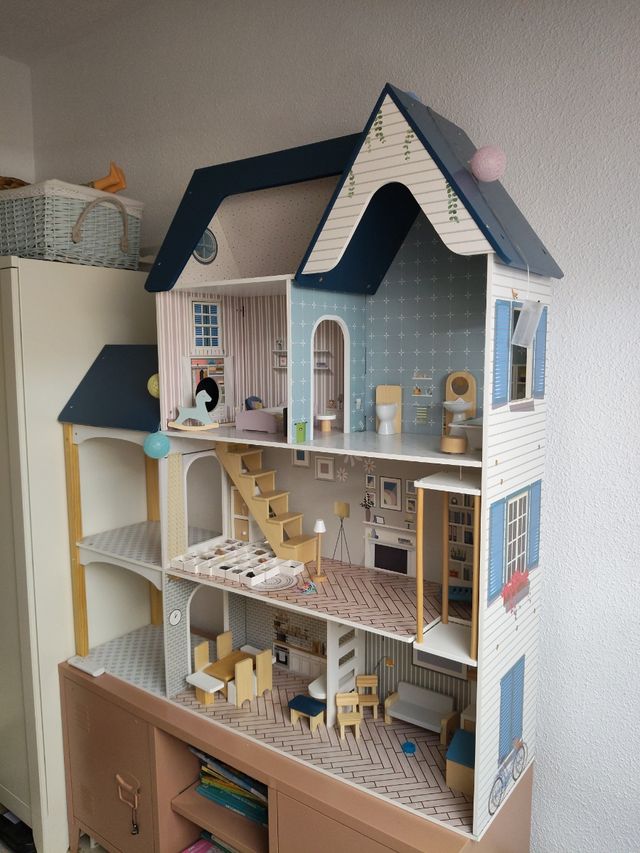 Detalles del productoPreciosa casa de muñecas de madera con múltiples habitaciones y accesorios.