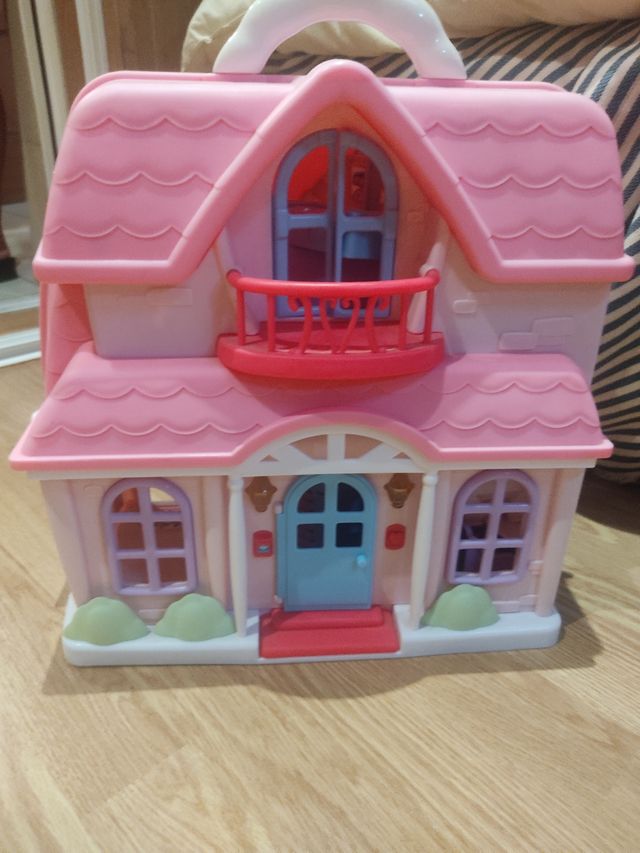 Casa de muñecas maletín, cómoda para transportar con todos sus accesorios, El timbre suena y ladra un perrito y se encieyla luz.