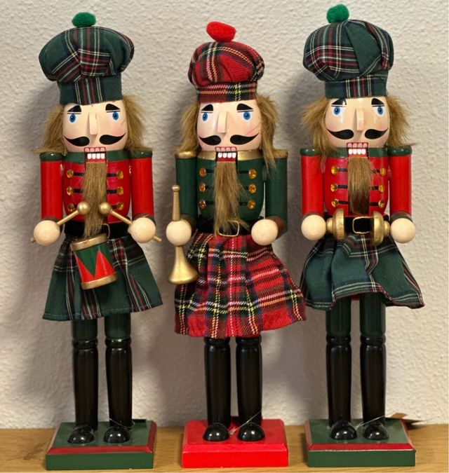 Detalles del productoConjunto de tres figuras de cascanueces de Navidad con diseño escocés. El precio es por unidad, antes de comprar dime cuál quieres y te hago el anuncio aparte.