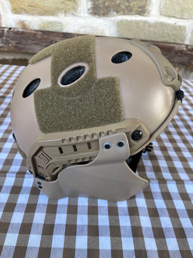 Detalles del productoCasco táctico para airsoft en color beige. Está en buen estado, con algunas marcas de uso minimas.