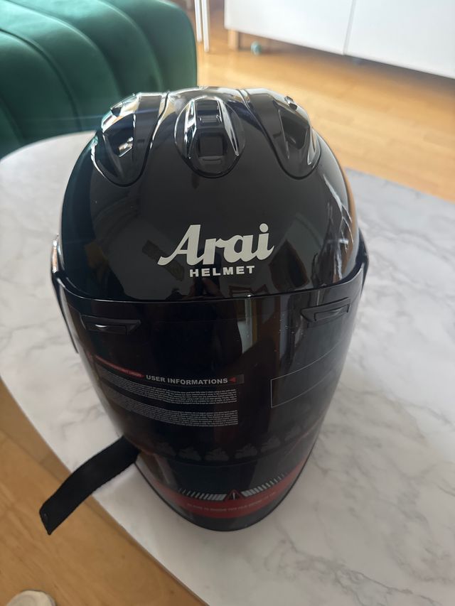 Casco de moto de la marca Arai. - Color negro brillante. - Visera integrada. - Correa de sujeción.