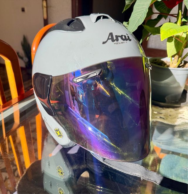 Casco Arai Ram III con pantalla iridiscente. - Color blanco. - Pantalla con acabado multicolor. - Diseño deportivo.