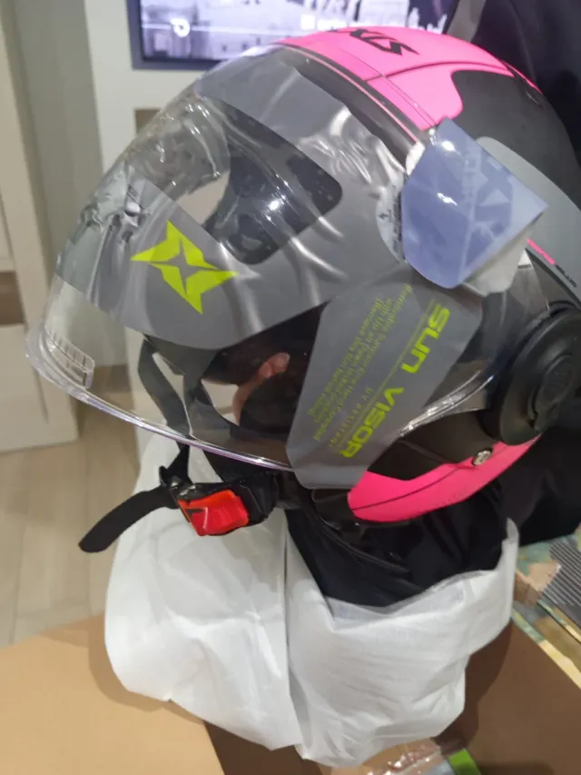 Casco de moto Axxis con un diseño moderno en rosa y gris. Incluye visor solar. - Visor solar retráctil. - Interior cómodo y seguro. - Cierre de seguridad.