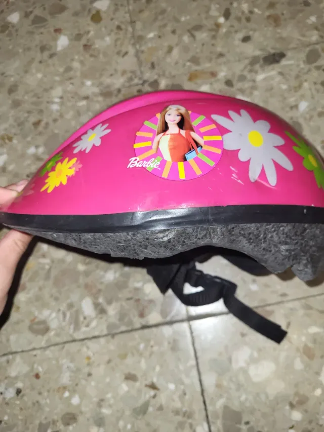 Casco de bicicleta infantil con diseño de Barbie. - Color rosa vibrante. - Decorado con flores y la imagen de Barbie. - Correa ajustable para mayor seguridad.