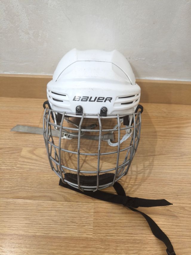 Casco de hockey Bauer en color blanco, listo para proteger. - Incluye rejilla protectora. - Cierre de correas ajustable. - Para categoría Benjamín y Alevin.