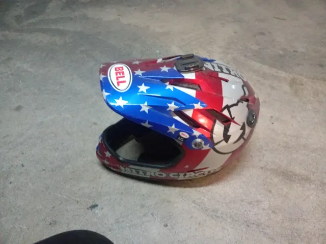 Detalles del productoCasco de protección con un diseño llamativo de estrellas y rayas, inspirado en la bandera estadounidense.