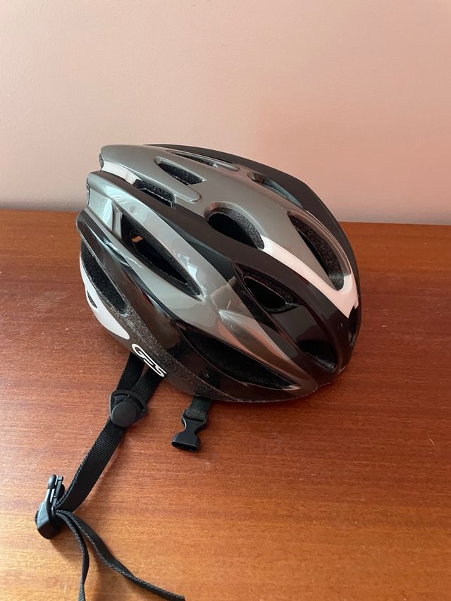 Casco para bicicleta en buen estado. Ideal para adultos. - Color gris y negro. - Diseño deportivo. - Sistema de ajuste trasero.