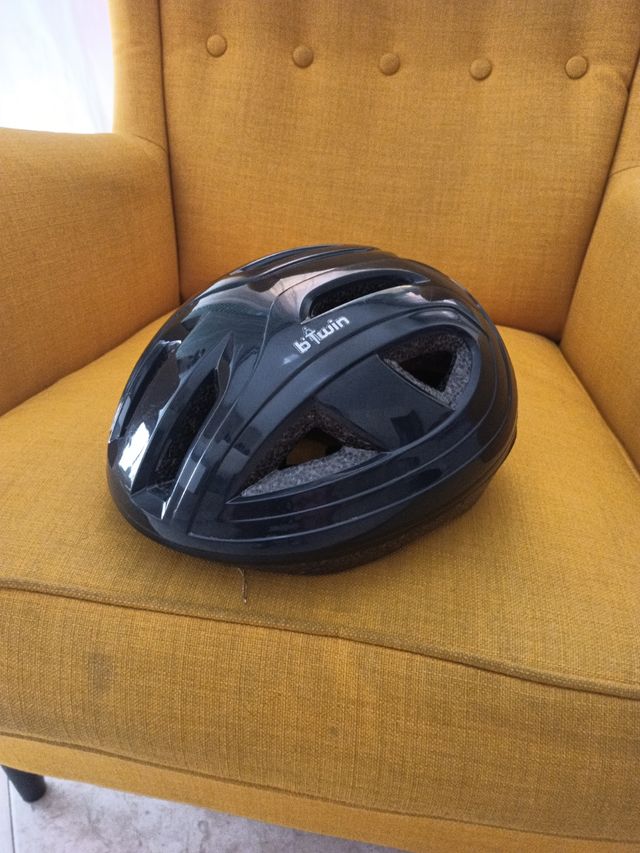 Detalles del productoCasco de bicicleta Btwin en perfecto estado. Es de color negro y tiene un diseño elegante.