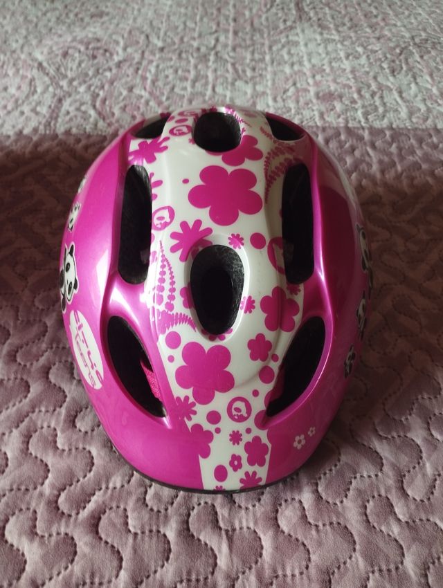 Casco para niña, ideal para bicicleta. Es de color rosa y blanco con un diseño floral. - Diseño con flores y pandas. - Color rosa y blanco. - Para niñas.