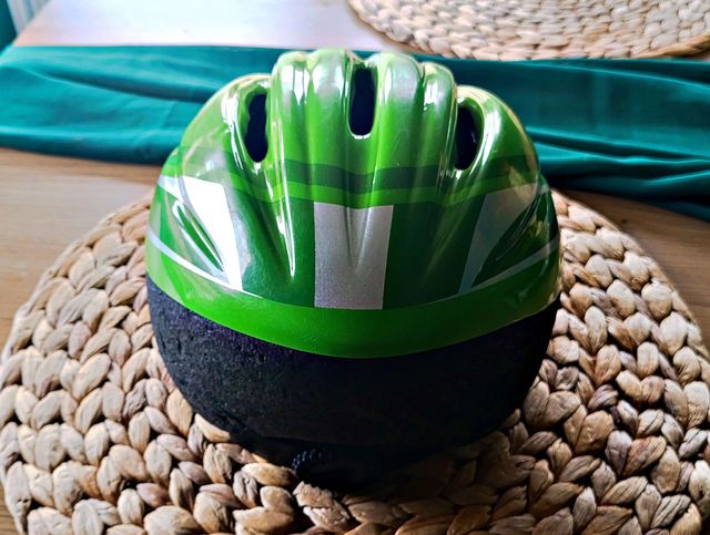 Detalles del productoCasco infantil de bicicleta, color verde y detalles plateados brillantes, interior negro.