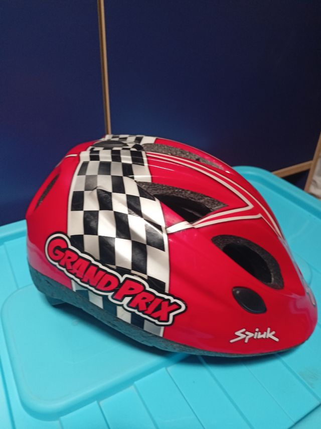 Casco de bicicleta para niño con diseño deportivo. - Color rojo con detalles de cuadros Grand Prix. - Marca Spink. - Diseño con ventilación.