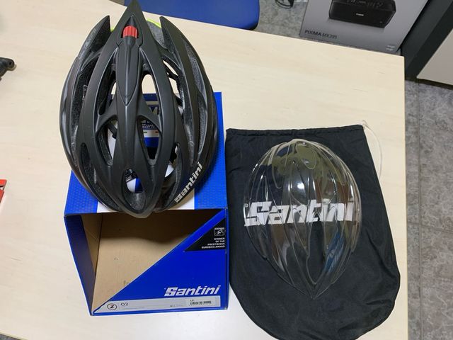 Detalles del productoCasco de ciclismo de la marca Santini en color negro. Incluye funda y carcasa trasparente anti lluvia. Además incluye gafas fotocromáticas Santini