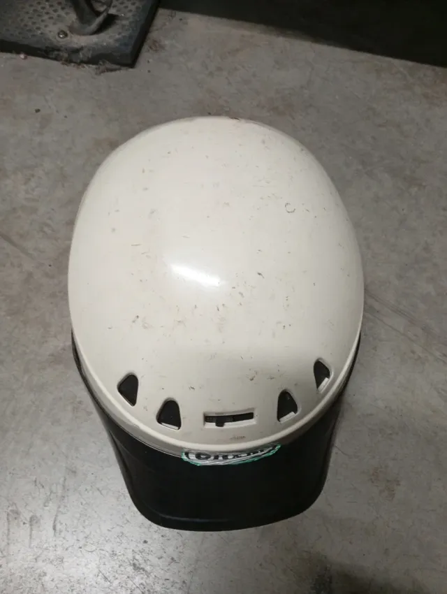 Casco de protección con diseño bicolor. - Parte superior blanca. - Visera y base en color negro. - Presenta ventilaciones en la parte superior.