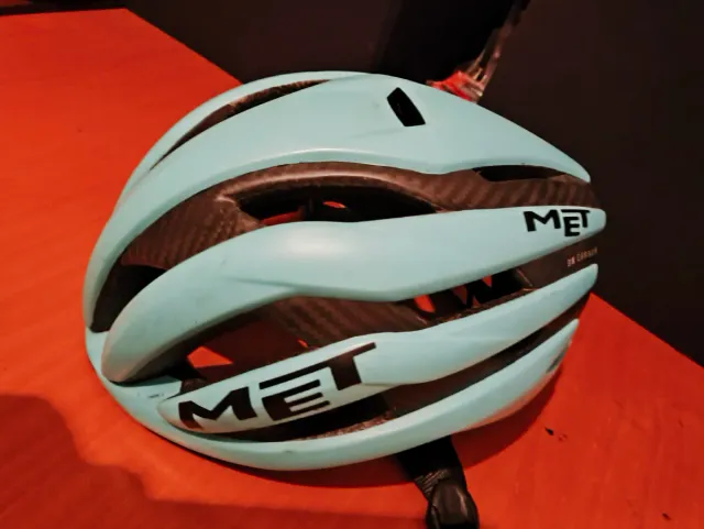 Casco de ciclismo MET con acabado en 3K Carbon. - Diseño aerodinámico. - Color azul claro. - Talla S.