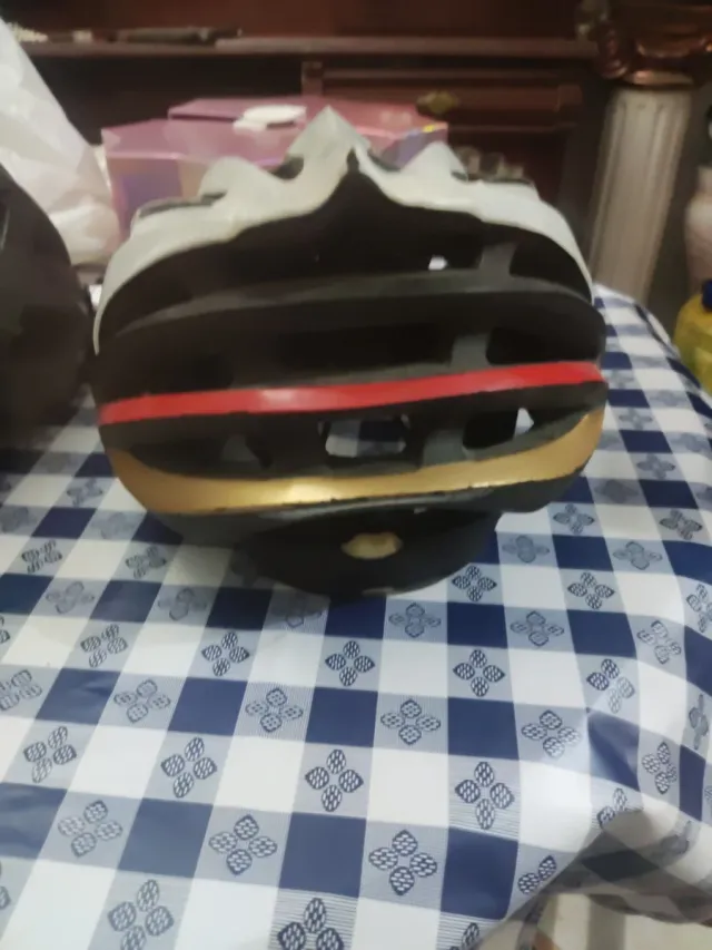Casco de bicicleta con diseño moderno y ventilado. - Color principal negro con detalles en blanco. - Banda decorativa en color rojo y dorado.