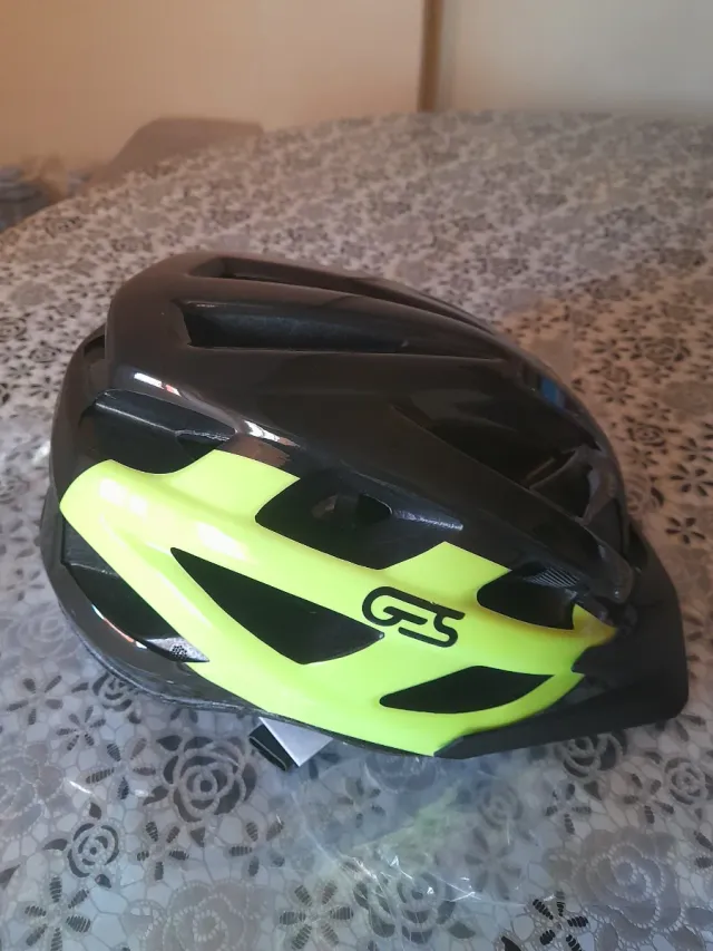 Casco de ciclismo con un diseño moderno y llamativo. - Color principal negro con detalles en amarillo neón. - Marca GS en el lateral.