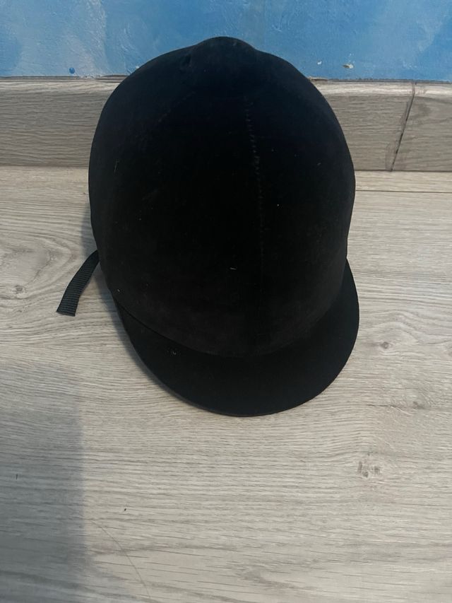 Casco de equitación de terciopelo negro. - Diseño clásico y elegante. - Correa ajustable para mayor seguridad.
