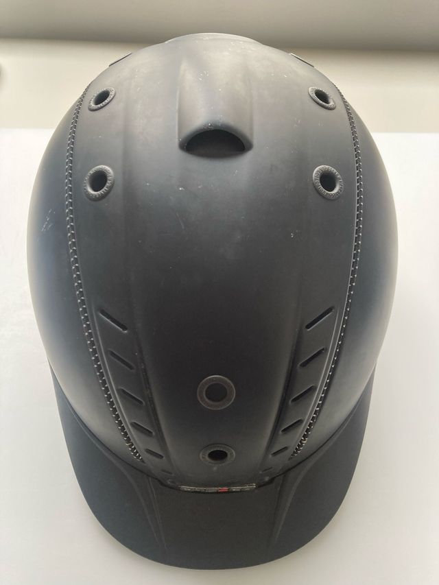 Casco de equitación en color negro. Diseñado para ofrecer protección y comodidad. - Diseño ventilado con múltiples orificios. - Visera integrada. - Acabado mate.