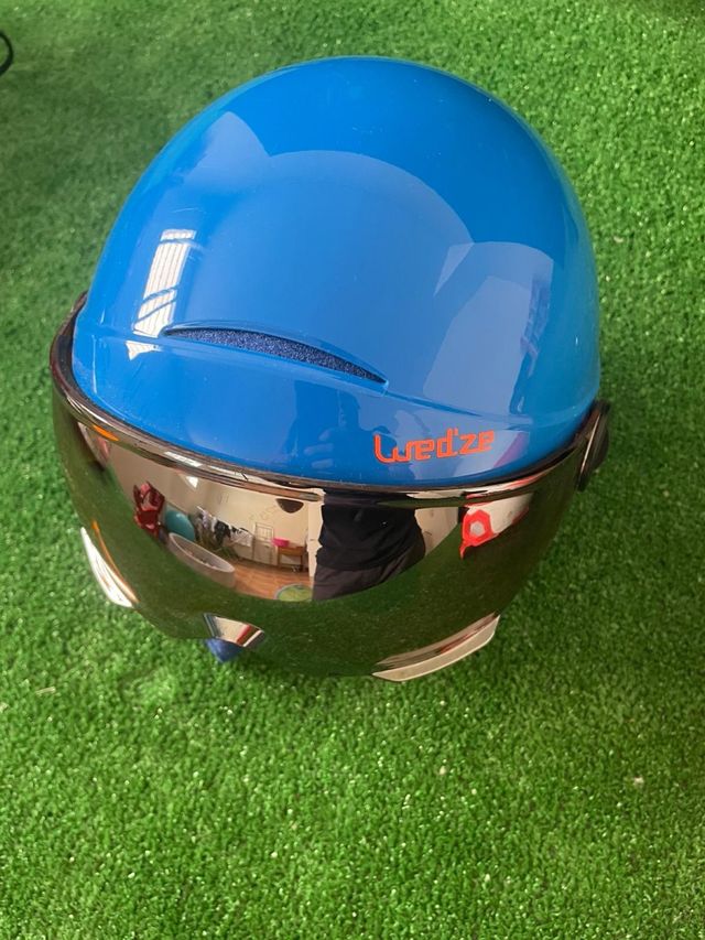 Casco de esquí infantil de color azul brillante, con visor integrado. - Marca Wedze. - Diseño moderno y seguro. - Visor con acabado espejo.