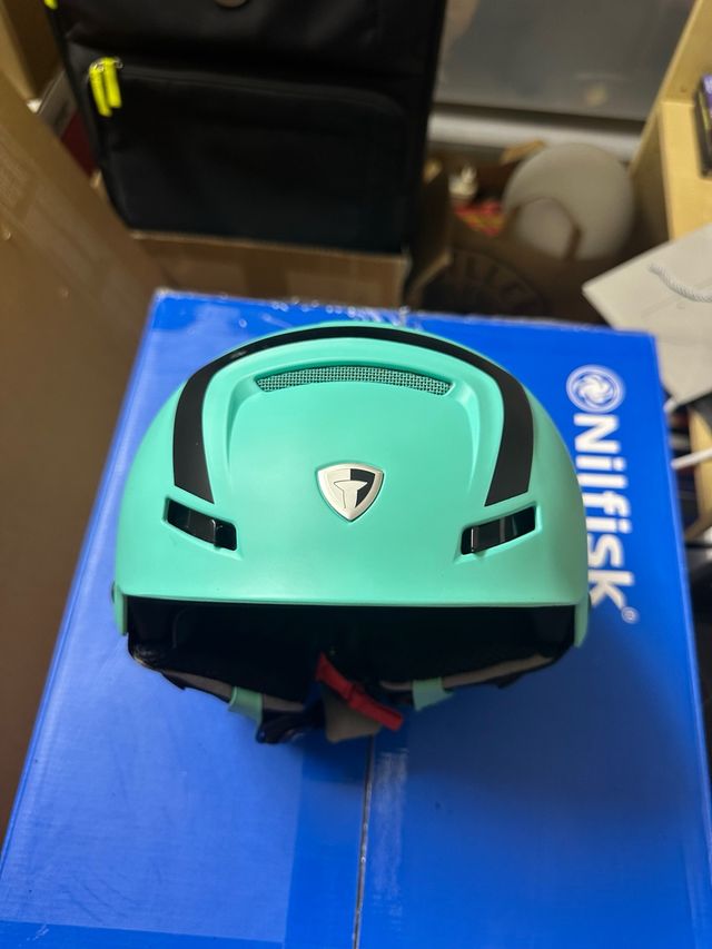 Detalles del productoCasco de esquí color turquesa con detalles en negro.
