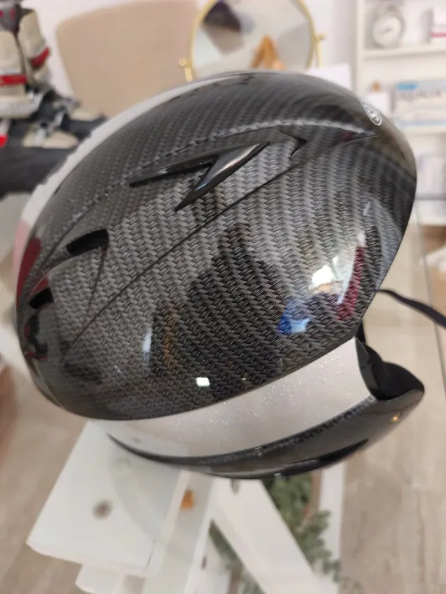 Casco de esquí con un diseño moderno y acabado en fibra de carbono. - Diseño deportivo. - Banda lateral plateada brillante.