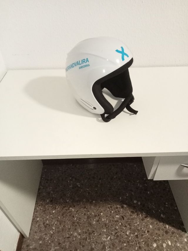 Detalles del productoCasco de esquí blanco con detalles en azul.