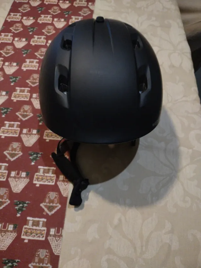 Casco de esquí en color negro, utilizado únicamente una vez. - Diseño moderno y seguro. - Correa ajustable para mayor comodidad.
