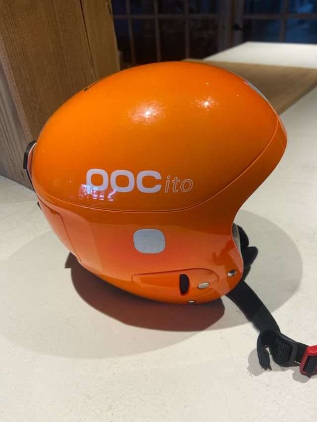 Detalles del productoCasco de esquí POCito en color naranja brillante, diseñado para la seguridad y visibilidad en la nieve.