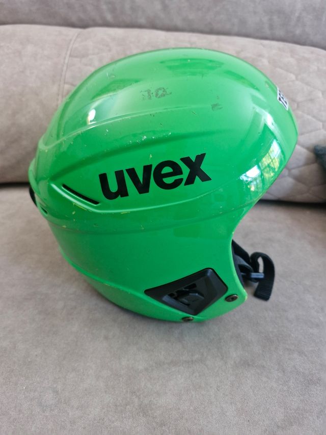 Casco de esquí de color verde brillante con el logo de Uvex. - Diseño deportivo. - Correa ajustable. - Ventilación.