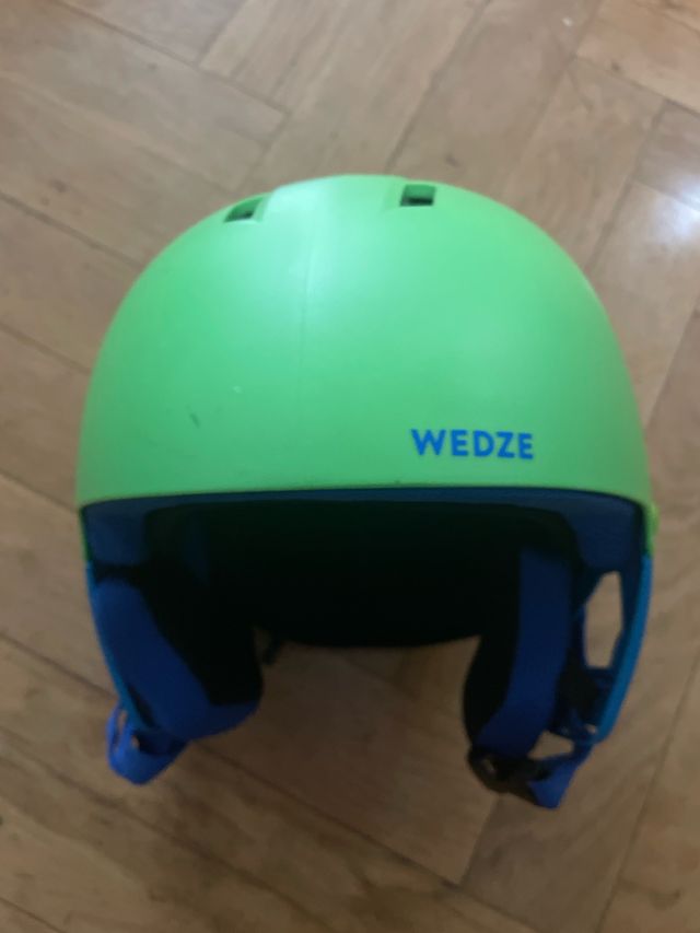 Casco de esquí de color verde brillante con detalles en azul marino y azul. - Marca: Wedze - Diseño para niños - Cierre de seguridad