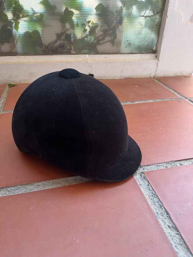 Casco de hípica de color negro. Nuevo. Sin usar. Talla 57. - Material de terciopelo. - Visera. - Detalle superior