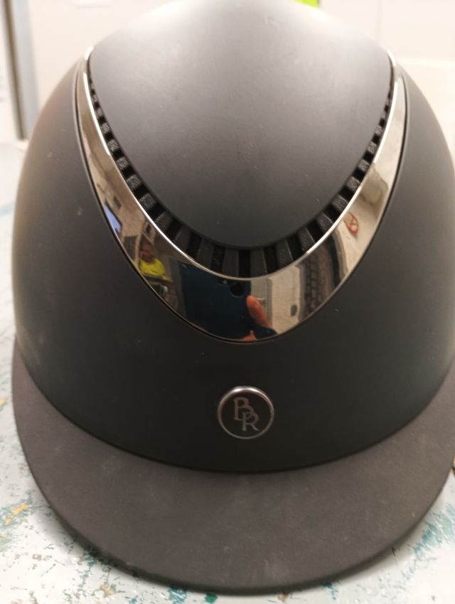 Casco de hípica de color negro con un diseño moderno y elegante. - Detalles frontales en acabado plateado. - Logo de la marca en la parte frontal.