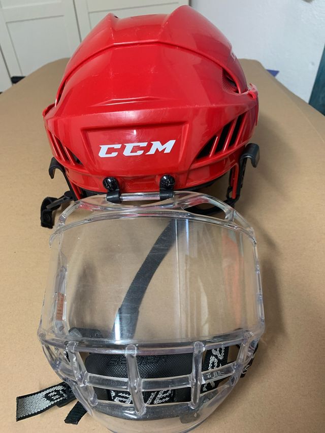Casco de hockey CCM de color rojo, diseñado para proteger. - Protector facial transparente incluido. - Cierre ajustable para mayor comodidad.