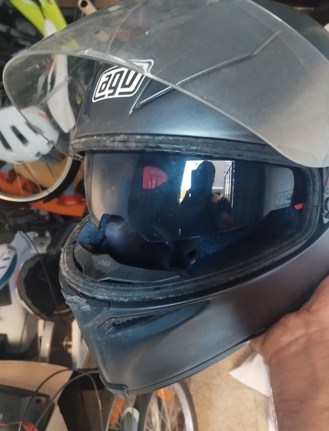 Casco de moto de la marca AGV. Diseño integral con pantalla. Talla L - Color negro. - Visera oscura. - Interior acolchado.