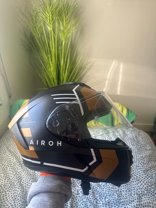 Detalles del productoCasco de moto Airoh con diseño moderno en negro y detalles dorados. Incluye pantalla transparente.