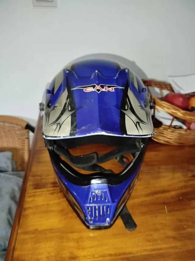 Casco de moto con diseño deportivo en tonos azul y gris. - Diseño con detalles gráficos. - Mentonera integrada. - Cierre de seguridad.