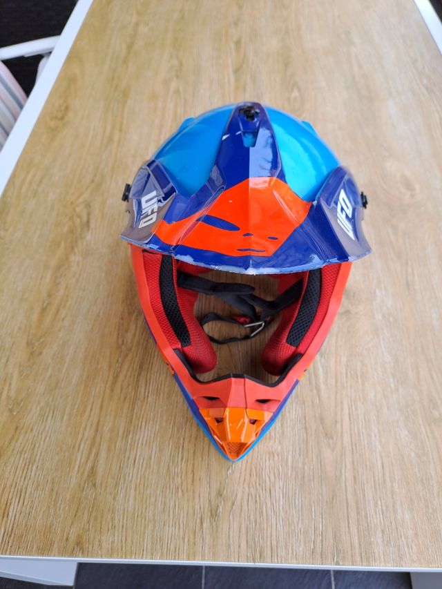 Casco de moto con un diseño llamativo en colores azul y naranja. - Diseño con logo UFO. - Interior rojo acolchado. - Mentonera naranja. - Talla L