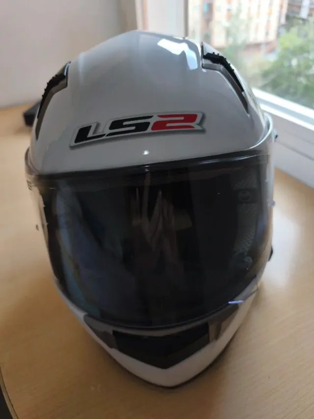 Casco de moto integral LS2 de color blanco. - Diseño aerodinámico. - Visera oscura. - Logo LS2 en la parte frontal.