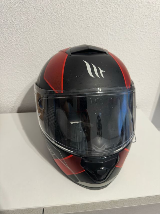 Detalles del productoCasco de moto con diseño deportivo en negro y detalles en rojo. Cuenta con una visera transparente.